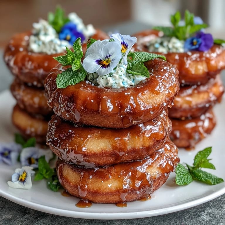 - Tuck edible flowers and mint leaves between donuts, distributing evenly for a natural, blooming look.