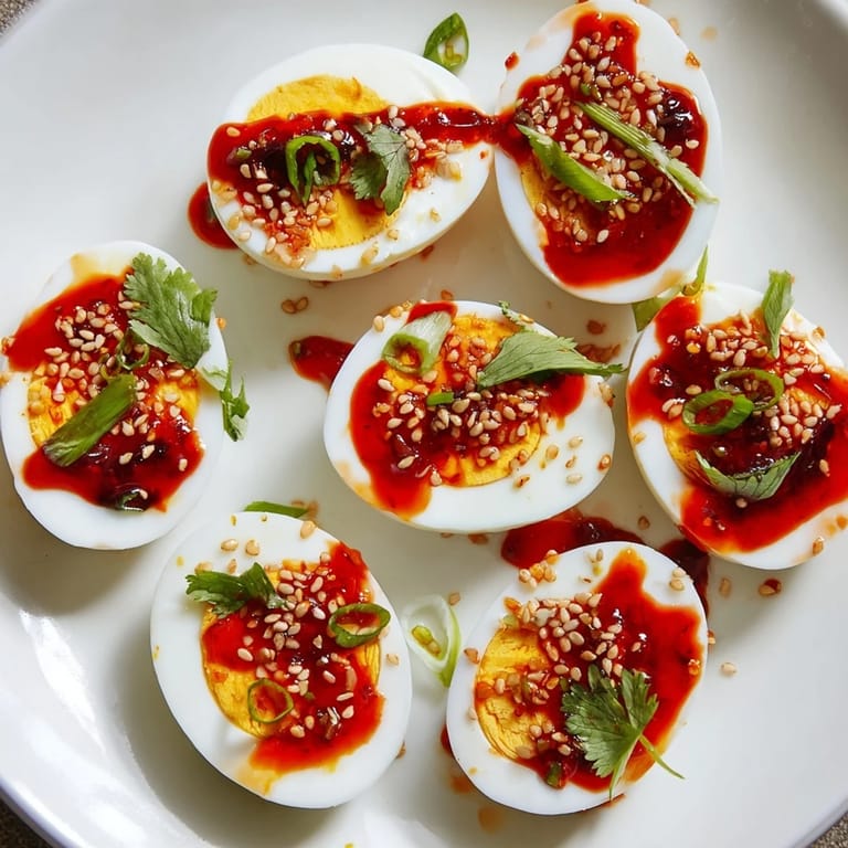 - Arrange the egg halves cut-side up on a plate and spoon that chili oil mixture generously over the top; don't be stingy with the oil or the sesame seeds.