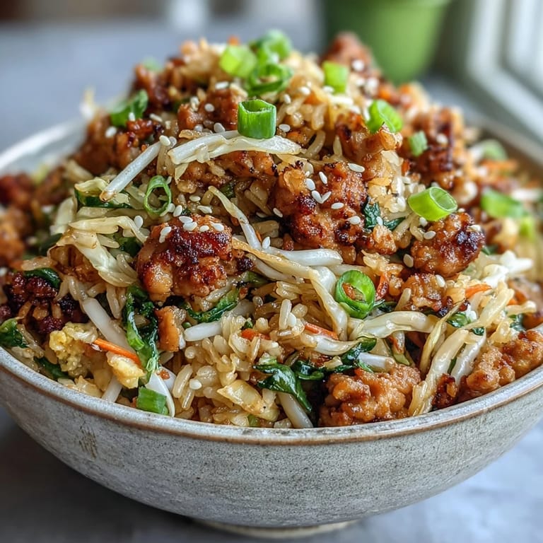 The beauty of this dish is how adaptable it is—swap the ground chicken for ground turkey or pork, or crumble tofu in for vegetarian versions. You can add bell peppers, snap peas, mushrooms, or water chestnuts depending on what's in your crisper drawer or what you're craving that day. Just keep the soy sauce, oyster sauce, and that sesame oil, because those are the flavors that make it taste like an egg roll rather than just any fried rice.